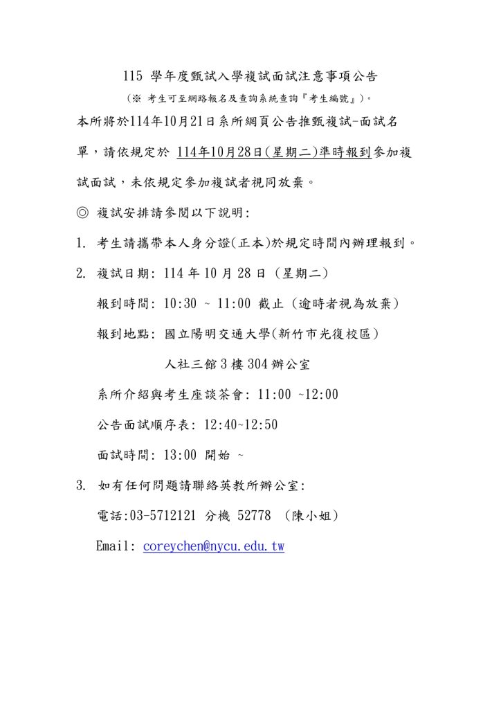 國立陽明交通大學 115 碩士班甄試入學招生初試合格名單
